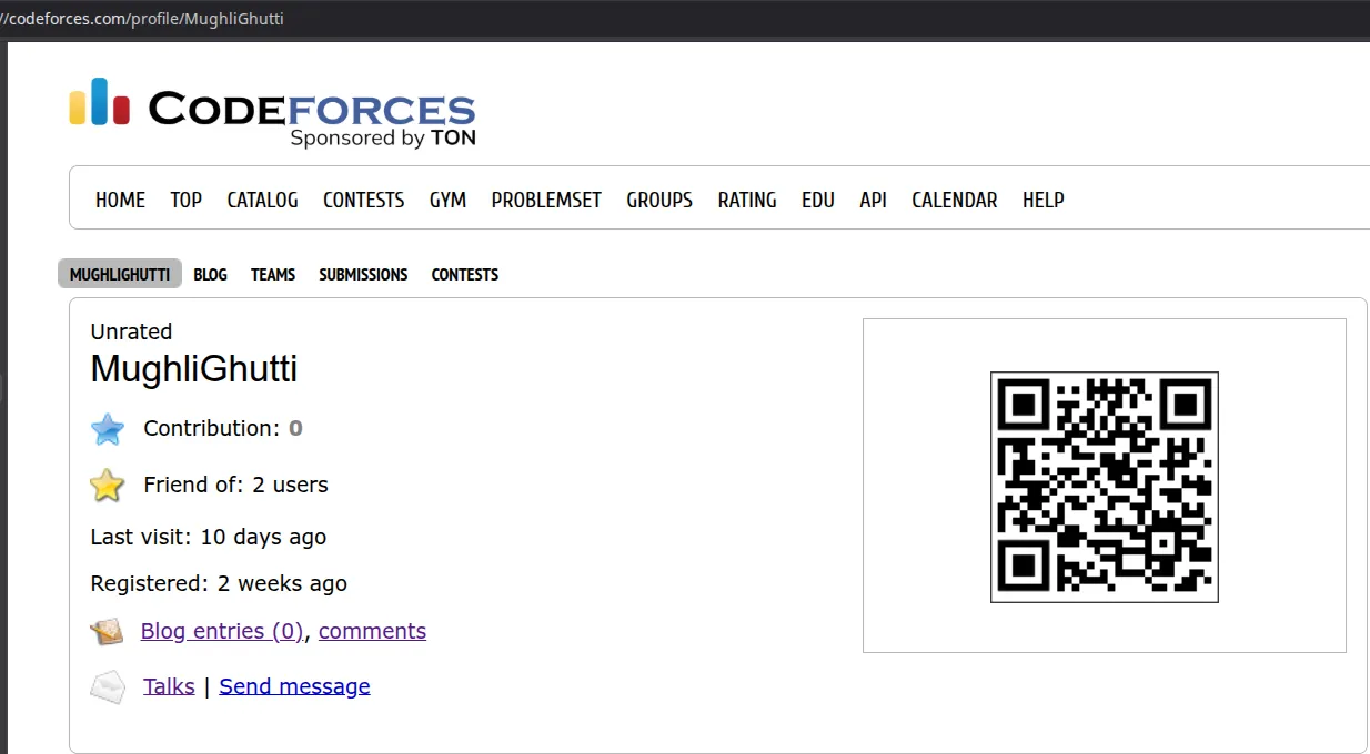 This wasn’t a big list, and the site codeforces stands out the most (guywithnoname54 had a codeforces account, but it was locked, that’s what gave it away for me). When you go there, you see an account with a QR Code as a profile picture (weird innit~)